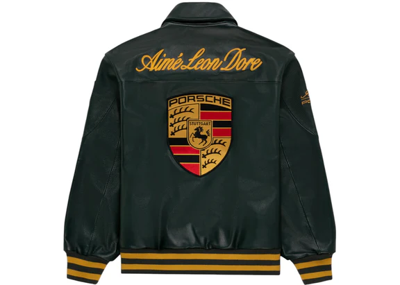 Motorsport-Inspired Design: Features embroidered logos and racing stripes for an authentic racing leather jacket vibe, reminiscent of collaborations like Aime Leon Dore x Porsche racing leather jacket or Boss Porsche contrast details leather jacket black.
